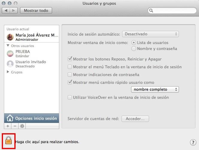 Ahora, antes de hacer cualquier modificación debes pulsar sobre el icono del candado que hay en la parte inferior izquierda de la ventana. Esto te permitirá proporcionar permisos de administrador para realizar la tarea de eliminar un usuario de Mac.