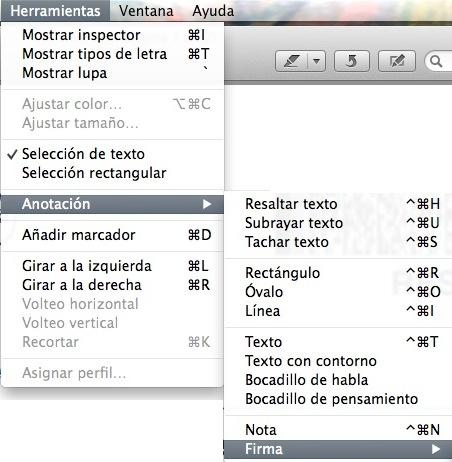 Una vez abierto el pdf con Vista Previa, debes acceder en el menú superior horizontal a la opción que dice "Herramientas". En el submenú, escoge "Anotación". Entonces, se abrirá otro menú, cuyo último ítem es "Firmas".