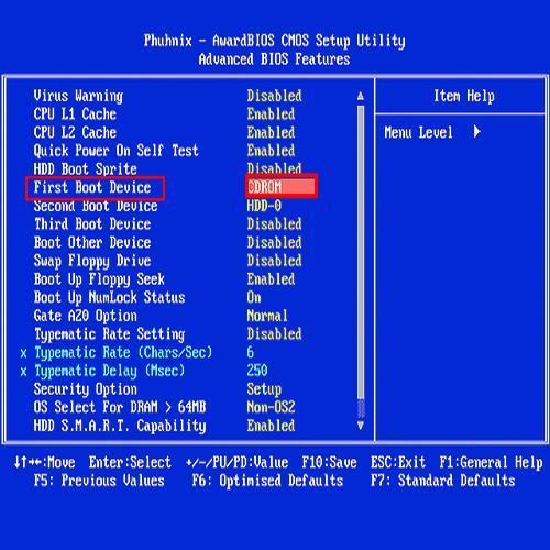 Selecciona la pestaña 'First Boot Device' (primera unidad de arranque) y elige la opción CD/DVD para que tu equipo inicie sesión desde el CD de Windows 7. Asegúrate de que las siguientes opciones se cumplan: 'Second Boot Device: Floopy' y 'Third Boot Device: HDD-0'.