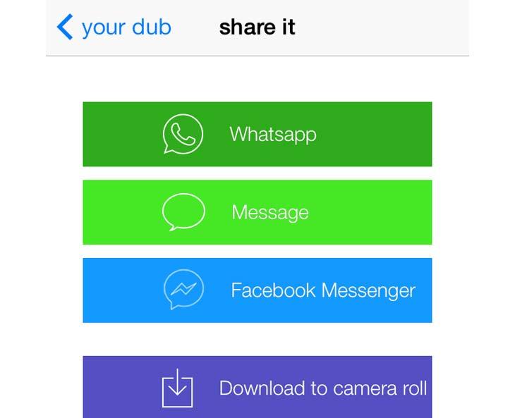 ¿De qué sirve hacer estos divertidos vídeos si luego no se los puedes enseñar a tus amigos? El tercer paso de Dubsmash es precisamente este: compartir tu creación con los amigos que elijas o directamente en redes sociales. Puedes compartirlo por Whatsapp, por SMS, por Facebook Messenger, o simplemente guardarlo en el smartphone.