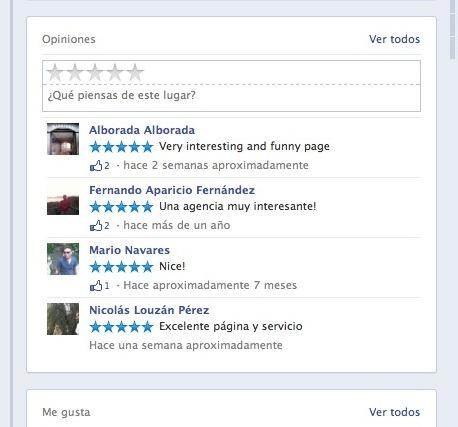 Las evaluaciones positivas que tus seguidores o cualquier otro usuario de la red social hacen de tu empresa. Esto se escribe en la columna derecha de tu fanpage, en la parte superior, siempre que tu Categoría implique ubicación física.