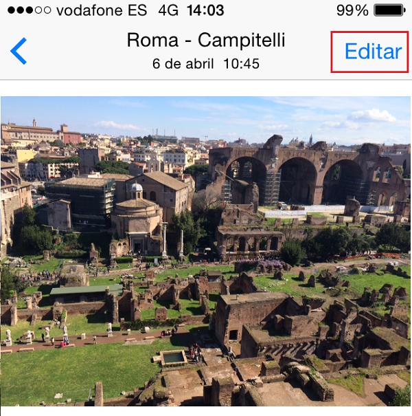 El siguiente paso es buscar la fotografía que deseas modificar para girarla hacia la posición que quieras. Una vez identificada, pulsa sobre ella y cuando se abra verás que en la parte superior derecha de la pantalla aparece la opción 'Editar'. Presiónala para poder empezar a realizar los cambios.