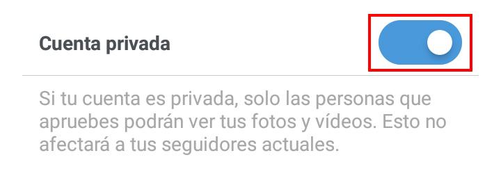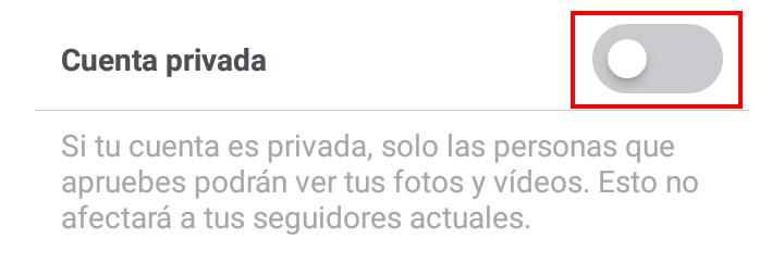 De este modo, con tan solo deslizar hacia la izquierda la pestaña de 'Cuenta privada' —de modo que el color azul se vuelva gris— volverás a abrir tu cuenta de Instagram a todos los usuarios de esta red social de fotografías. Así pues, ahora todos podrán ver tus imágenes, poner likes, comentar, seguirte sin necesidad de que apruebes la solicitud, etc.