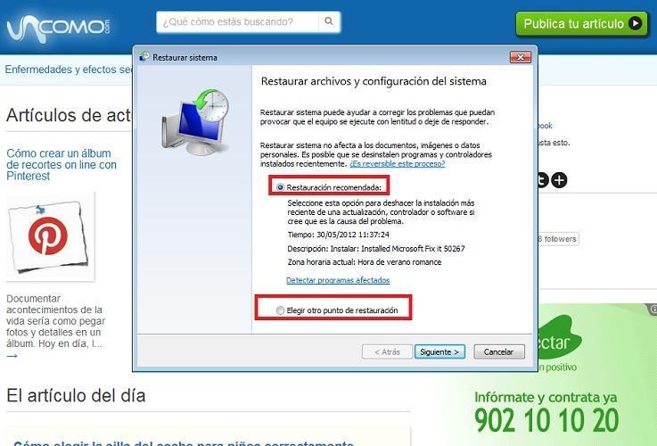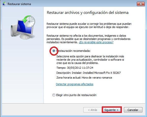 Revisa cuidadosamente la información que aparece en esa ventana. Tiene un botón de radio llamado "Recomendar Restauración" y otro llamado "Elegir un punto de restauración". Windows selecciona el "Restauración Recomendada" de forma automática. Ésta opción permite a Windows restaurar el equipo utilizando su punto de restauración más reciente. Esa fecha del punto de restauración y la hora aparecen en la ventana. Una descripción también explica un resumen de lo que sucedió antes de que Windows crea el punto de restauración. Por ejemplo, si un se instaló un nuevo programa de gráficos, usted puede ver su nombre en la descripción.