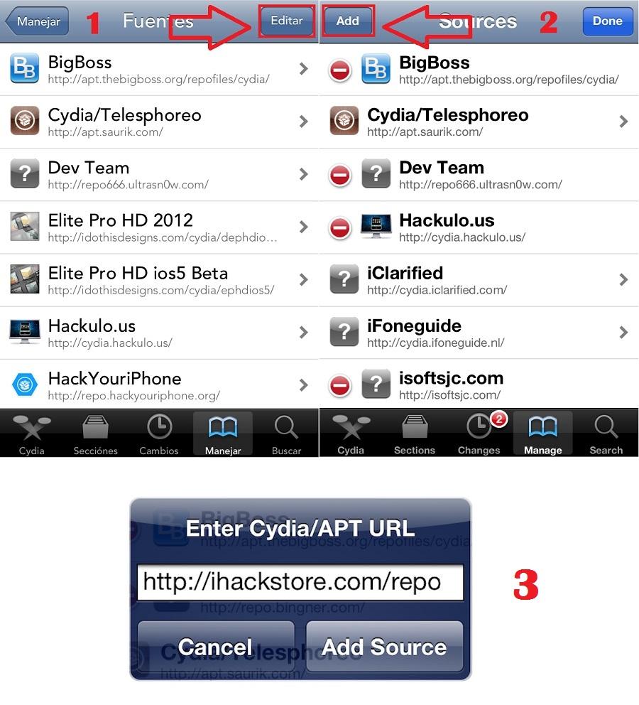 Una vez dentro de 'Manejar', presiona sobre 'Sources' o 'Fuentes'. Allí, dale a 'Edit' o 'Editar', y luego a 'Add' o 'Agregar' para añar el repositorio. Verás que se ha abierto una ventanda donde debes indicar el repo, escribe 'ihackstore.com/repo/' y dale a 'Add Source' o 'Agregar Fuente'. Deberás dejar que se instale el paquete y presionar sobre 'Return to Cydia' cuando haya finalizado. Si durante el proceso te aparece una ventana de aviso no te preocupes, dale a 'Agregar de todos modos'.
