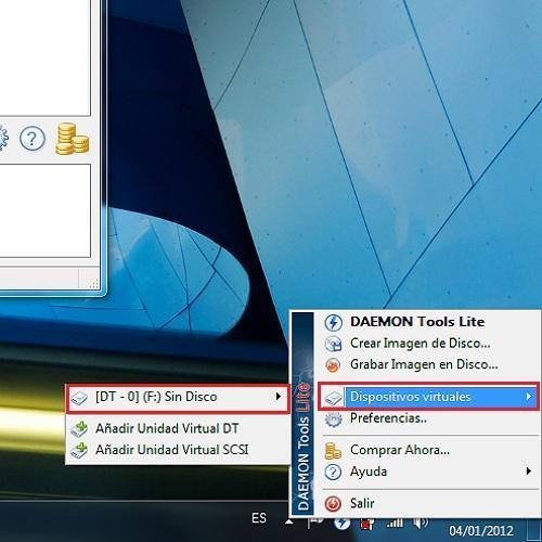 Ejecuta Daemon Tools y dirígete a tu barra de herramientas, donde debe aparecer el icono del programa, tal y como aparece en la imagen. Pulsa botón derecho encima de éste, selecciona 'Dispositivos virtuales' para, seguidamente, pulsar '[DT-0] (F:) Sin disco' y hacer click en 'Montar Imagen'.