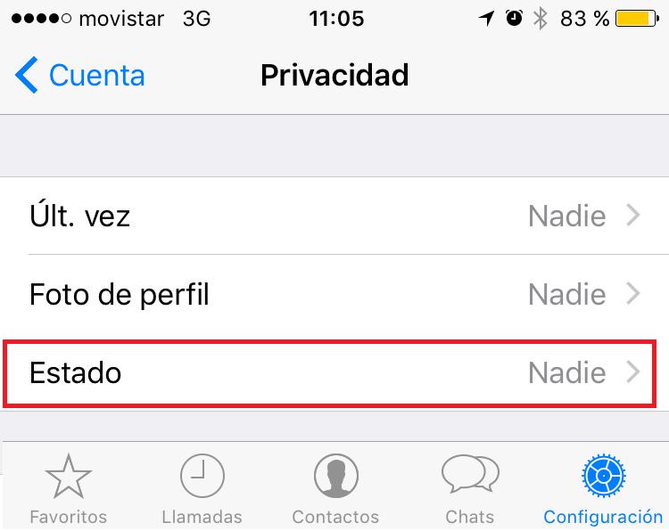 Todas estas pestañas de ajustes nos permiten regular cada cosa a nuestro gusto, por ejemplo, las Confirmaciones de lectura podemos activarlas o desactivarlas y estas nos sirven para conocer o no, según lo que elijamos, si los contactos a los que escribimos han leído o no el mensaje. De igual forma, si la desconectamos ellos no podrán ver si nosotros hemos leído el mensaje o no. Por lo tanto, en este menú tienes varias posibilidades de ajustes que pueden interesarte. En este caso, para quitar "En línea" de WhatsApp, deberás entrar en la pestaña de Estado.