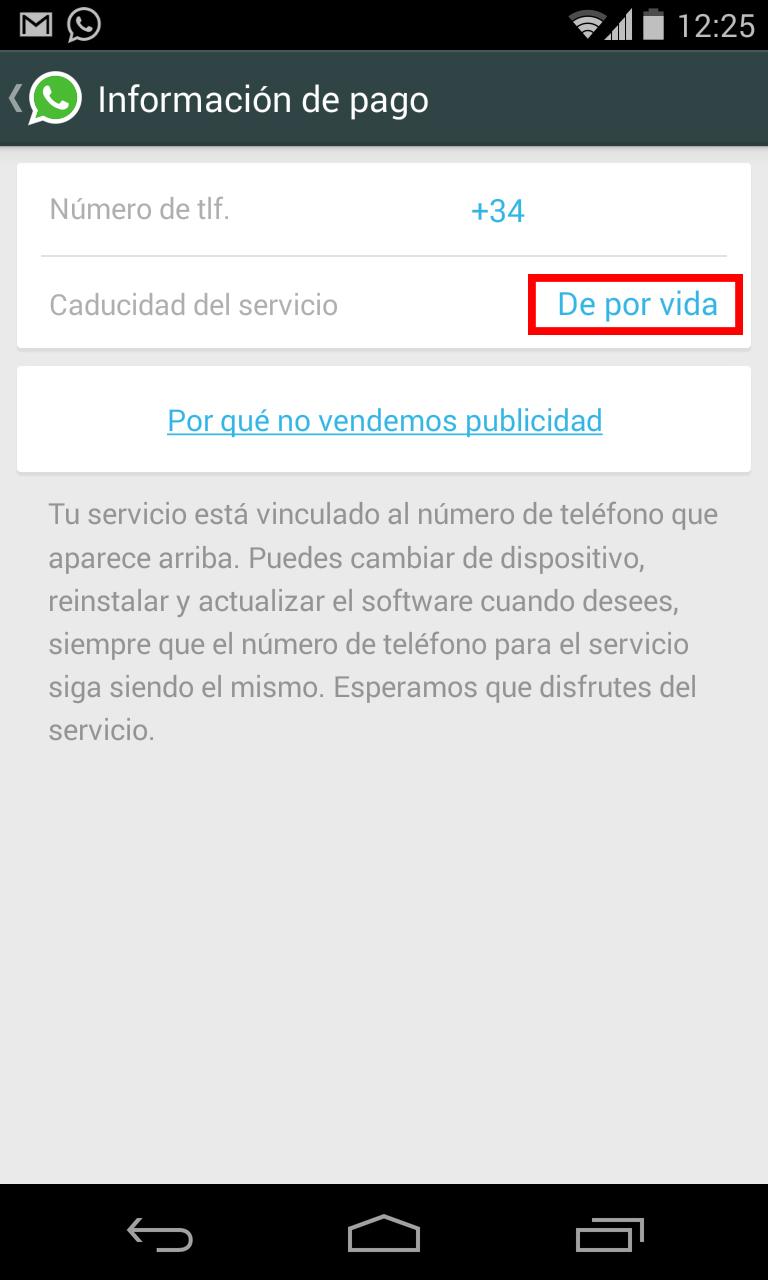 En caso de que debas pagar Whatsapp, te aparecerá la fecha en que caduca tu servicio y, por lo tanto, deberás renovar tu suscripción. Cuando se aproxime la fecha, el servicio de mensajería instantánea te avisará y no te lo cobrará directamente, sino que podrás renunciar en caso de que no desees renovarlo ni pagarlo.