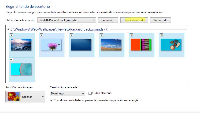 Debes saber que existe una opción en la que puedes escoger una serie de fotos o escogerlas todas marcando el botón de "Seleccionar todo" y que se irán pasando de forma automática por tu ordenador cada X minutos (también podrás determinar este tiempo en la opción que te aparece en la parte derecha inferior de la pantalla). Esta es una opción genial para que tu ordenador vaya pasando todas las imágenes que tú quieras ver.