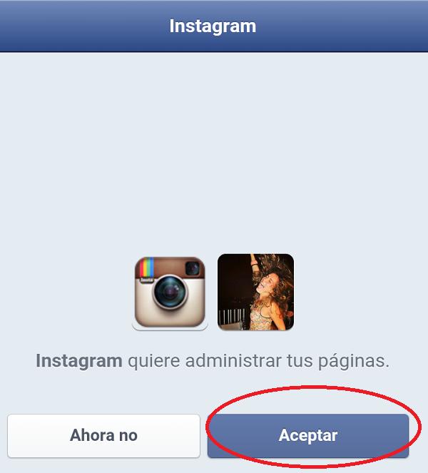 Si tu cuenta no estaba previamente vinculada la aplicación te pedirá que confirmes la acción, una vez que ambas estén enlazadas el sistema detectará que administras una o varias páginas en Facebook, entonces recibirás una notificación como la que vez en la imagen donde se informa que "Instagram quiere administrar tus páginas". Presiona aceptar y tus páginas de fans también estarán vinculadas a esta red social.