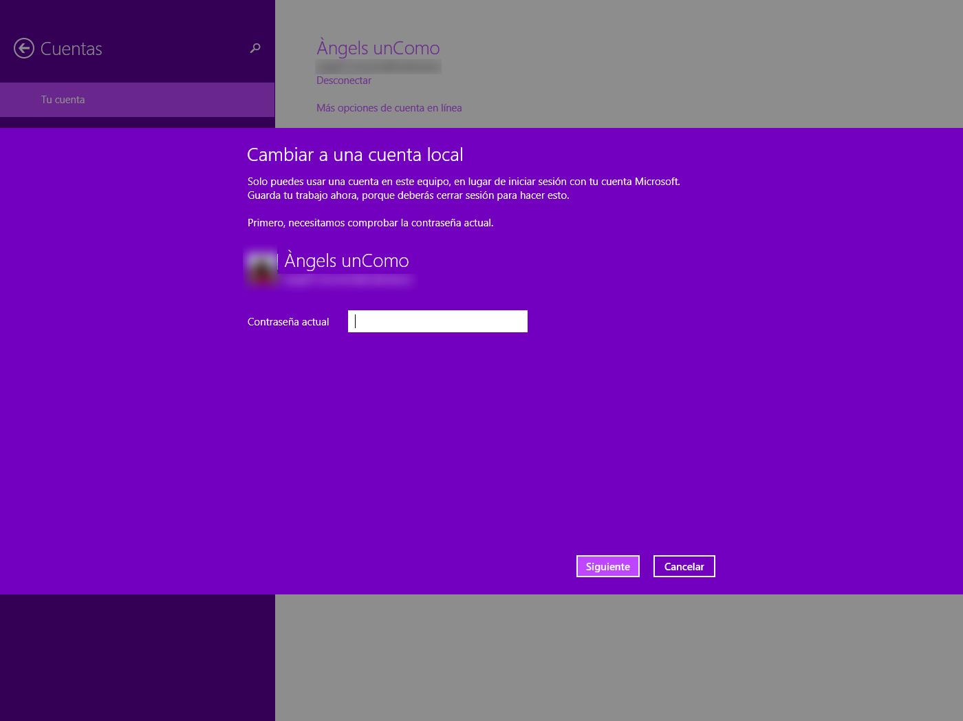 Ahora será necesario que escribas la contraseña de tu cuenta de Microsoft, la que usabas hasta ahora para iniciar la sesión en tu Windows 8 y hacer clic en 'Siguiente'. Se trata de un proceso de seguridad y verificación para confirmar que quieres quitar la contraseña de tu cuenta y convertirla en una cuenta local.