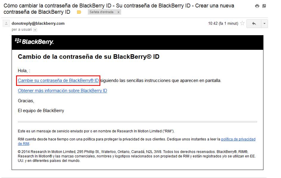 El siguiente paso consistirá en hacer clic en el primer enlace que encontrarás en el correo electrónico recibido. De esta forma, serás redirigido de nuevo al servicio de Blackberry ID para continuar con la recuperación de la contraseña.