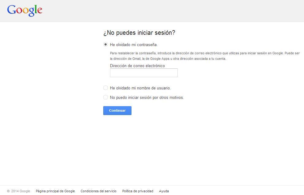 Al seleccionar la primera opción "He olvidado mi contraseña", Google te pedirá que escribas la cuenta de correo electrónico para la que quieres recuperar el password. Tecléala y dale al botón azul para continuar.