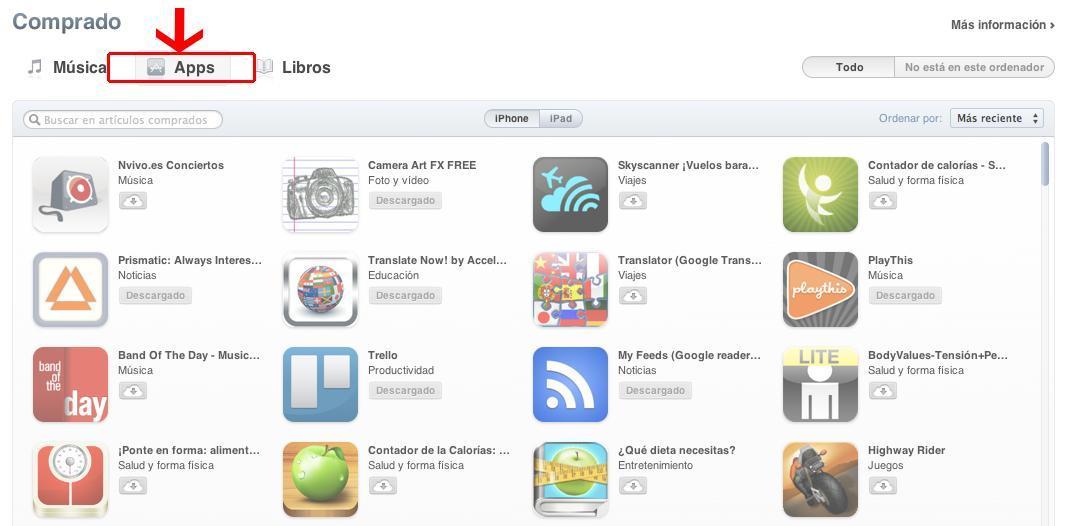 Aquí puedes ver todas las aplicaciones que has comprado en el pasado, descargarlas o, si conectas tu iPhone al ordenador, descargarlas en tu móvil.