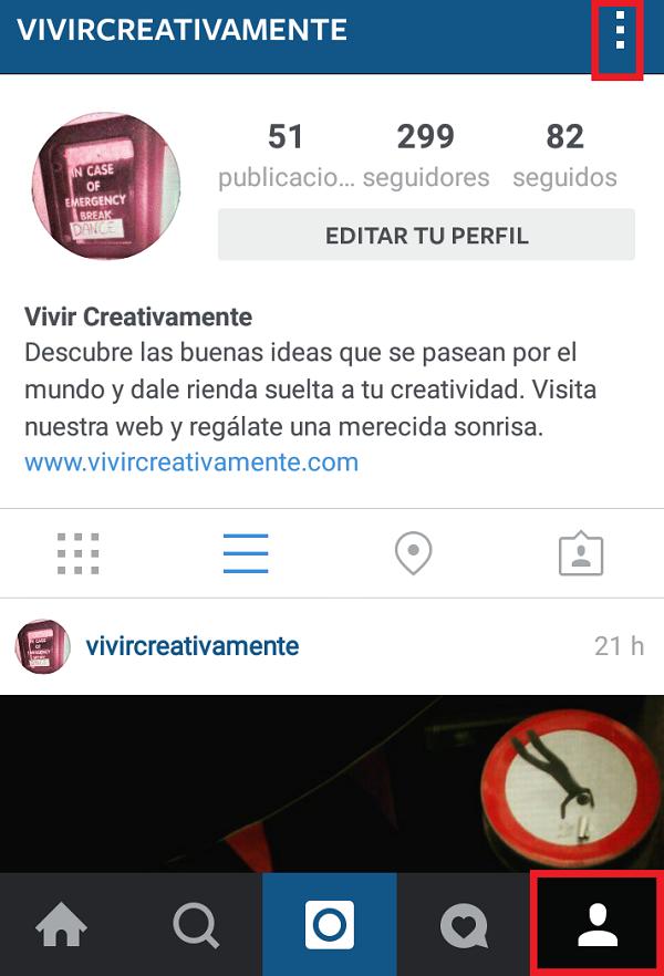 Saber qué fotografías te han gustado en Instagram es posible en tan solo segundos. Para conseguirlo ingresa a tu cuenta en esta red social y, una vez dentro, presiona el icono del muñeco que se encuentra abajo a la derecha. Después ve a los tres puntos (o la tuerca en el caso de iOs) ubicados en la esquina superior derecha para dirigirte a tu perfil.