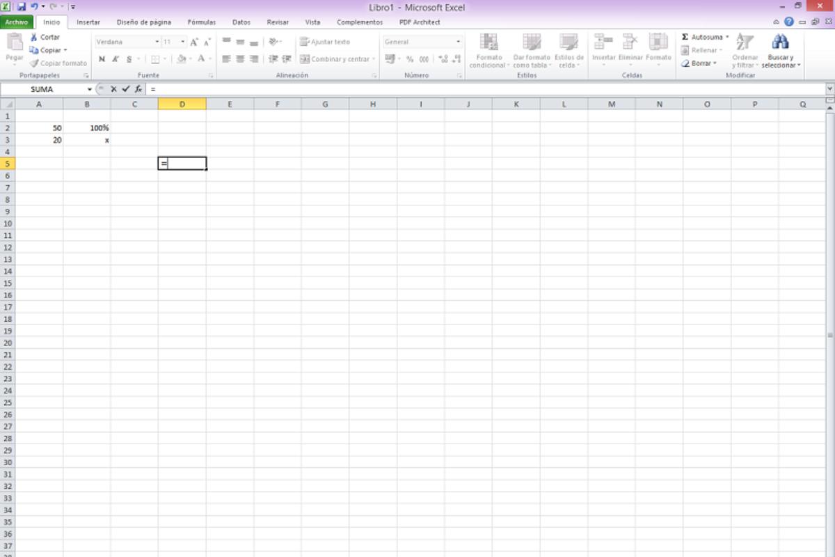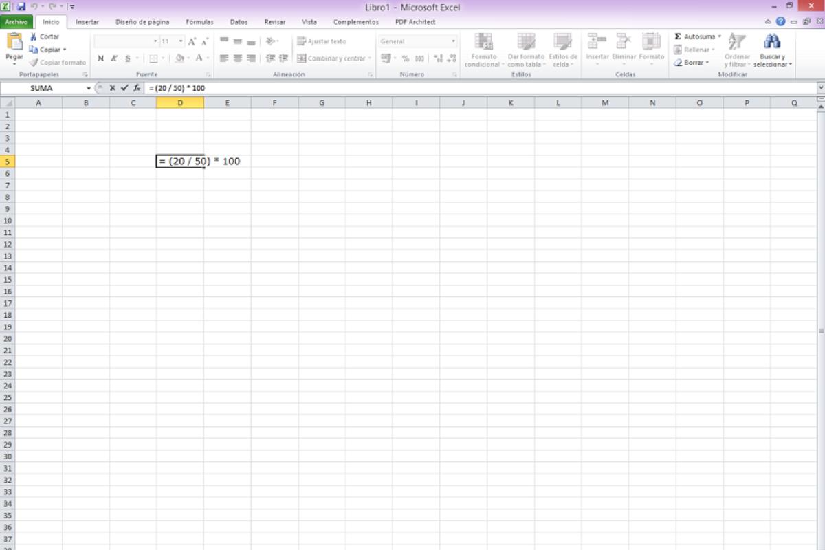 Para realizar esta operación matemática en Excel y encontrar el porcentaje, deberás escribir en la celda seleccionada "= (20 / 50) * 100" (sin las comillas).