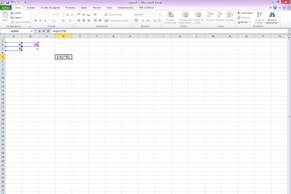 A continuación, deberás ir seleccionando las celdas que contienen los valores numéricos y escribir los símbolos matemáticos de las operaciones pertinentes y finalmente presionar la tecla Intro o Enter. De este modo, la fórmula estará formada por los códigos alfanuméricos de las celdas, en nuestro ejemplo: "=A3/A2*B2"