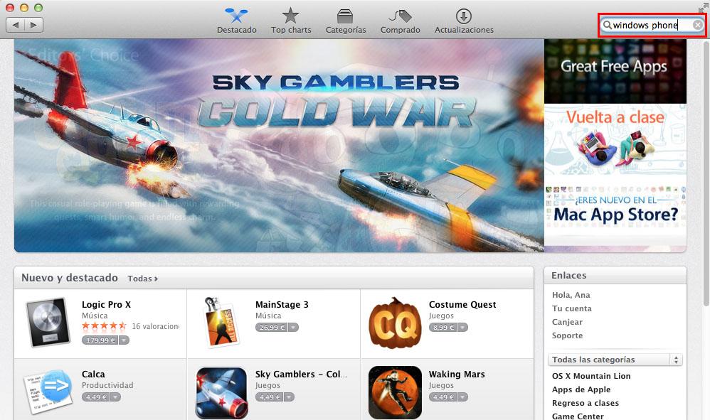 Para proceder a sincronizar Windows Phone y Mac, necesitas hacerte con la aplicación Windows Phone en la Mac App Store. Para ello, abre la tienda y, en el buscador (en la parte superior derecha), escribe "Windows Phone". Pulsa Enter.