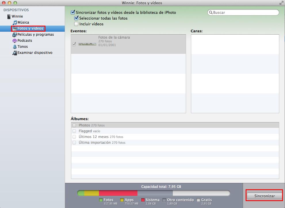 Para sincronizar todos los contenidos del teléfono, pulsa en el botón Sincronizar que aparece abajo a la derecha. Si quieres sincronizar solo un tipo de archivos (música, fotos, etc), escógelo en el menú de la izquierda y pulsa en Sincronizar.