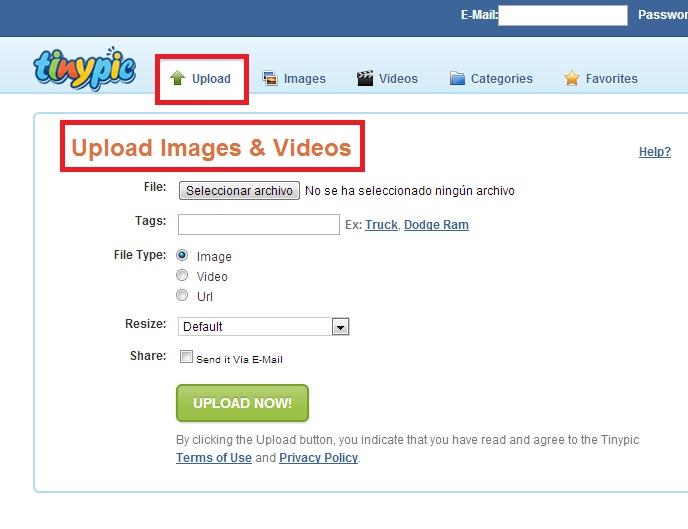Lo primero que debes hacer para subir tus imágenes es acceder a la página de Tinypic. Una vez dentro, verás que automáticamente se abre una de las pestañas principales, 'Upload'. Como verás, la ventana lleva el título de 'Upload Images&Videos', de manera que será esta interfaz la que utilizaremos.