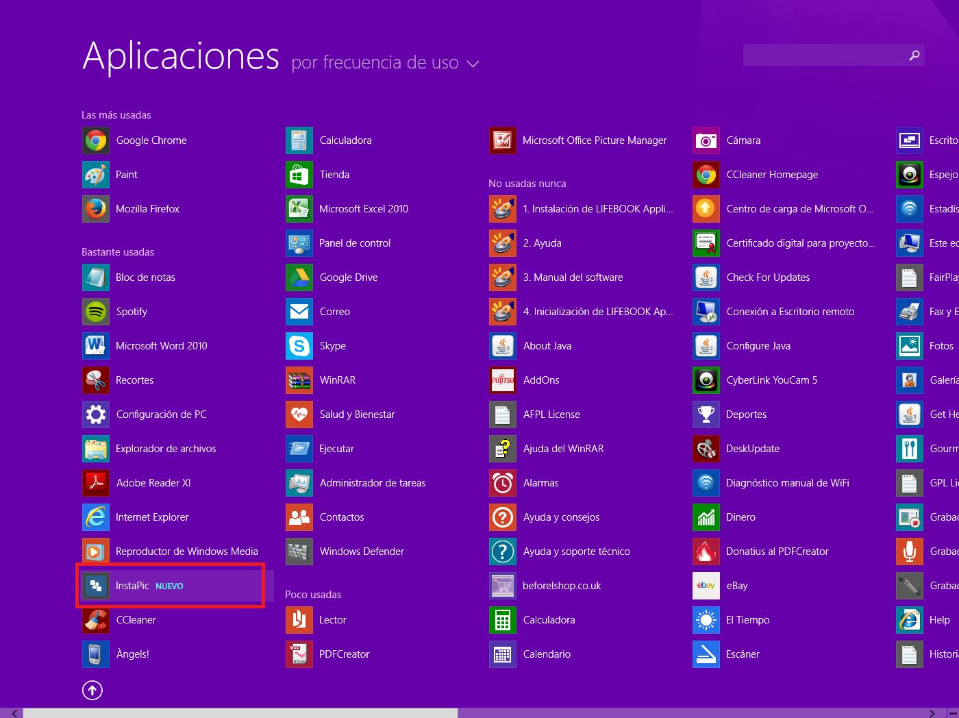Busca InstaPic en el listado de todos los programas y accesorios de tu Windows 8; en caso de que no lo encuentres, puedes usar el buscador de la parte superior derecha. Con tan solo empezar a escribir el nombre de esta aplicación, te aparecerá y podrás entrar directamente.