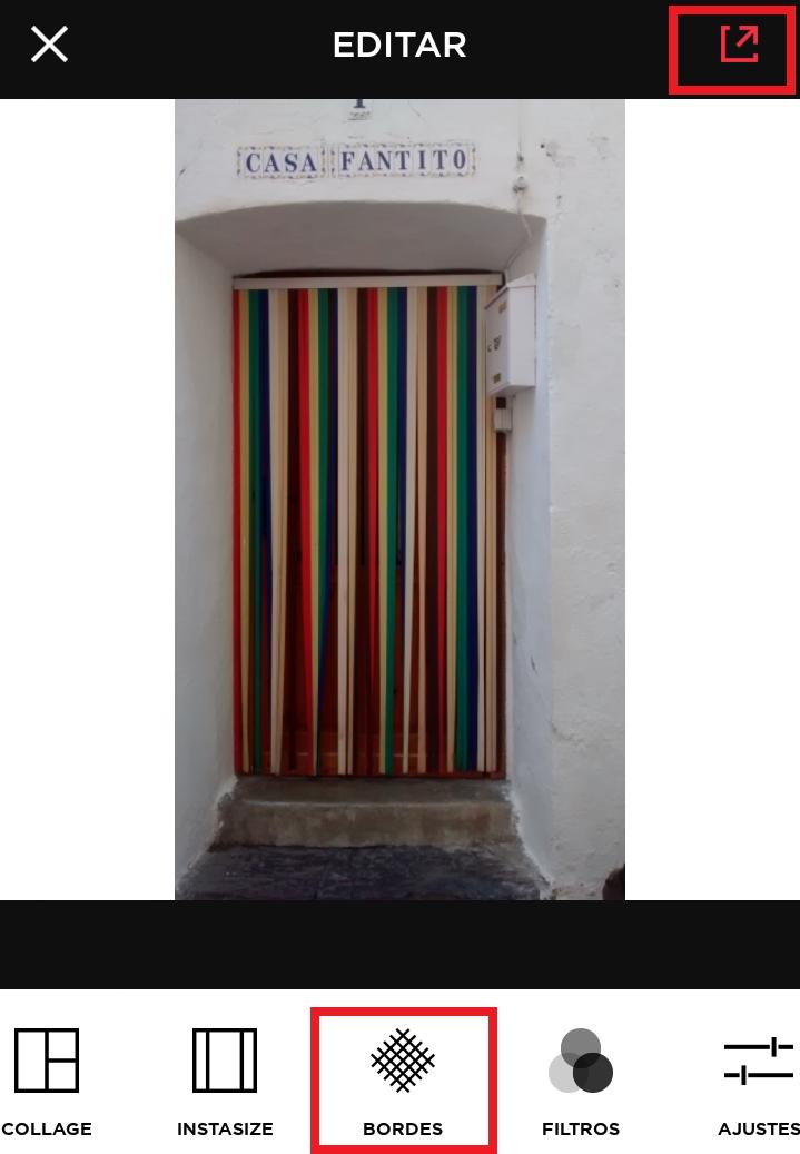 Una vez que has elegido la imagen podrás seleccionar entre varias opciones que se encuentran en la parte inferior de la pantalla. La que te permite redimensionar la foto es la alternativa de Bordes, con la que podrás añadir a tu foto los bordes laterales en el color que prefieras o usando un par de efectos especiales para un resultado más original.