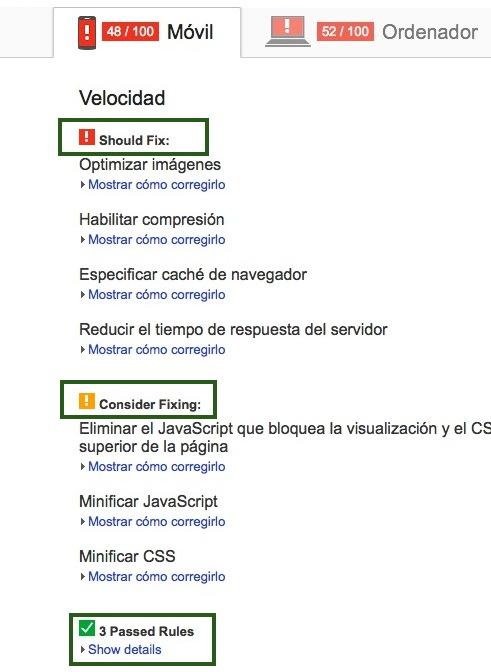 La versión móvil es la que sale peor parada con un 48 sobre 100. Además de la información textual con las recomendaciones, PageSpeed Insights te presenta una imagen con el aspecto que presenta la página web analizada en un smartphone.