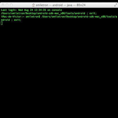 Abre una terminal (dirígete a 'Aplicaciones', 'Utilidades' y, seguidamente, 'Terminal.app'). Arrastra dentro de la ventana de la terminal el archivo 'mksdcard'; este fichero se encuentra dentro de una carpeta que se llama 'Tools'. Tras la línea que la terminal crea, escribe '1024M sdcard1.iso', presiona intro y acude a tu carpeta personal, donde ahora habrá un archivo llamado "sdcard1.iso".Arrastra este nuevo archivo hasta la carpeta creada en el primer paso.
