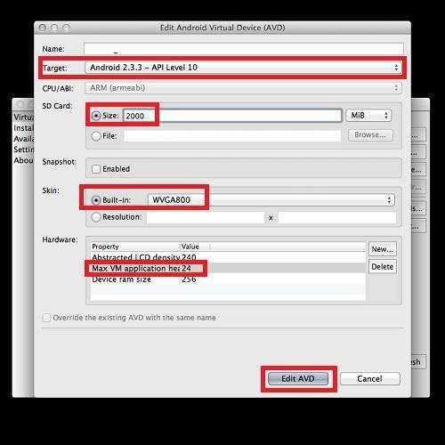 Vuelve al panel izquierdo de la aplicación y pulsa, esta vez, en 'Virtual Devices' para seleccionar, seguidamente, 'New'. Te aparecerá una nueva ventana que te pedirá un nombre; escribe el que desees y presiona en 'Target Android 2.3.3 API Level 10'. En el apartado 'SD Card', escribe 2000 y, en 'Skin', escoge la opción WVGA800. Para terminar, selecciona 'Mac VM application hea...' y haz click en 'Edit ADV'.