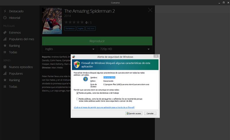 La primera vez que uses la aplicación de Cuevana Storm, es posible que el Firewall de Windows te solicite permiso para usar este programa, por lo tanto deberás hacer clic en la opción "Permitir acceso" de la ventana emergente.