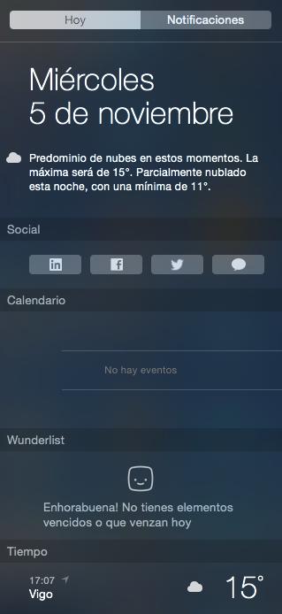 El Centro de Notificaciones apareció en los Mac con Mavericks, pero en Yosemite da un paso más allá. Se divide en dos pestañas ("Hoy" y "Notificaciones"). En la primera podrás ver de un vistazo lo más importante del día: fecha, previsión del tiempo, qué tienes apuntado en la agenda, si tienes tareas por hacer. Se puede personalizar con múltiples widgets, de forma que te muestre solo lo que más te interesa.