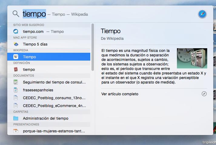 Si usas Spotlight a menudo también notarás el gran cambio de forma inmediata: el buscador aparece en el centro de la pantalla y ya no busca solo dentro del ordenador. Consultará también información en Internet, consultando la Wikipedia, noticias, la cartelera, iTunes, etc., intentando personalizar la experiencia lo más posible. La vista previa de los resultados es también más grande y práctica: podrías leer un documento, enviar un mail e incluso llamar por teléfono solo pulsando en el resultado.